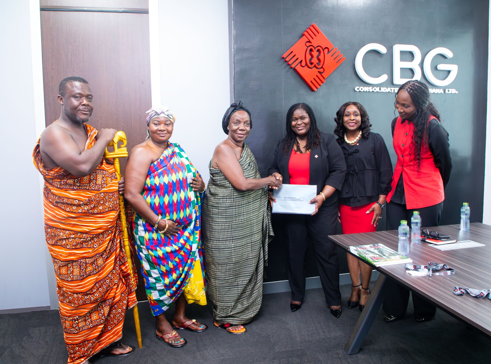 It was a humbling moment when Dr. Naomi Wolali Kwetey, MD of Consolidated Bank Ghana LTD (CBG) and her two deputies, Madam Sheila Azuntaba and Madam Florence Adei Ohene, received a delegation of Nananom from the Akuapem Traditional Area, representing Obrempongkese Oseadeeyo Kwasi Akuffo III, to pay a courtesy call on the management of the Bank.