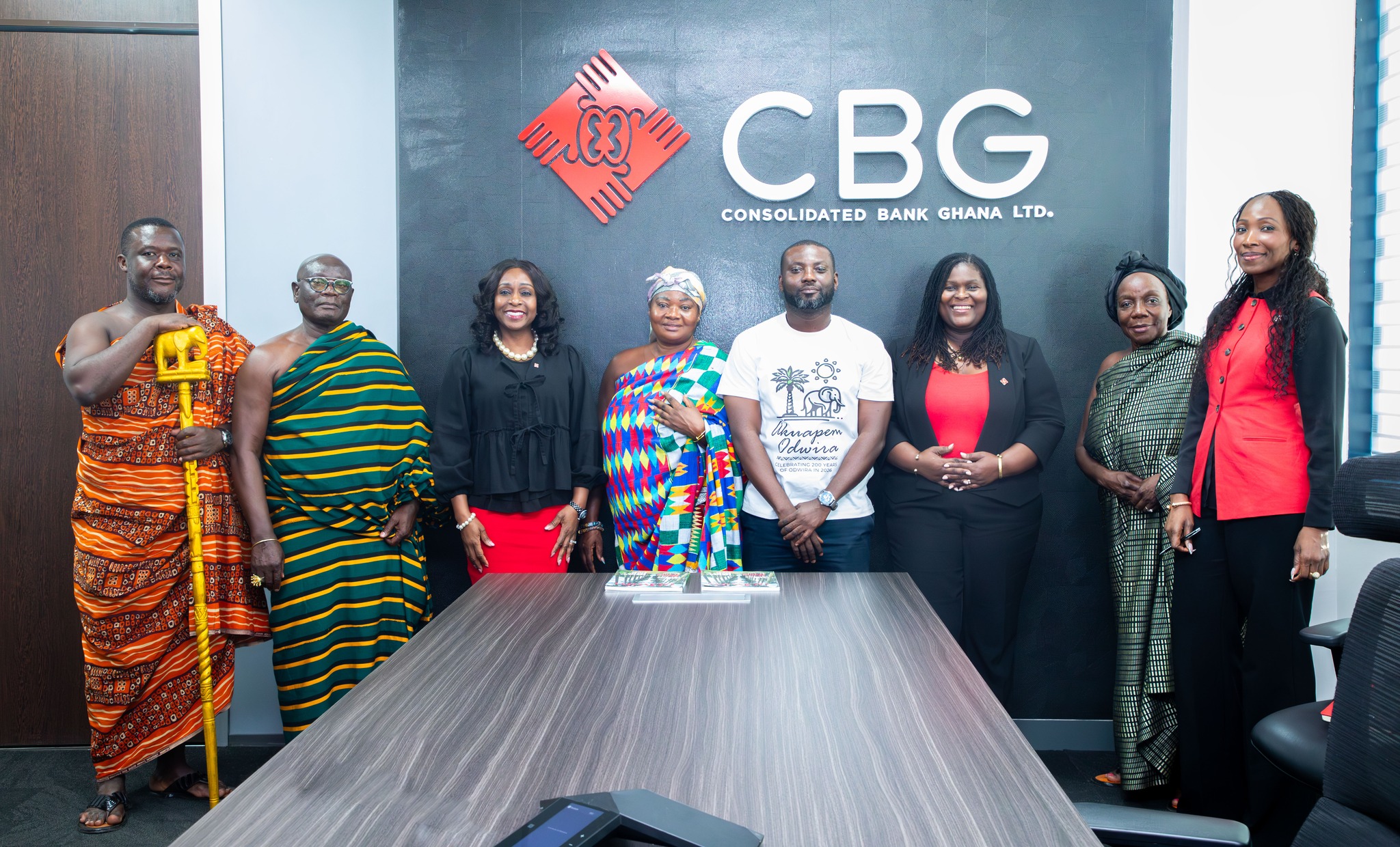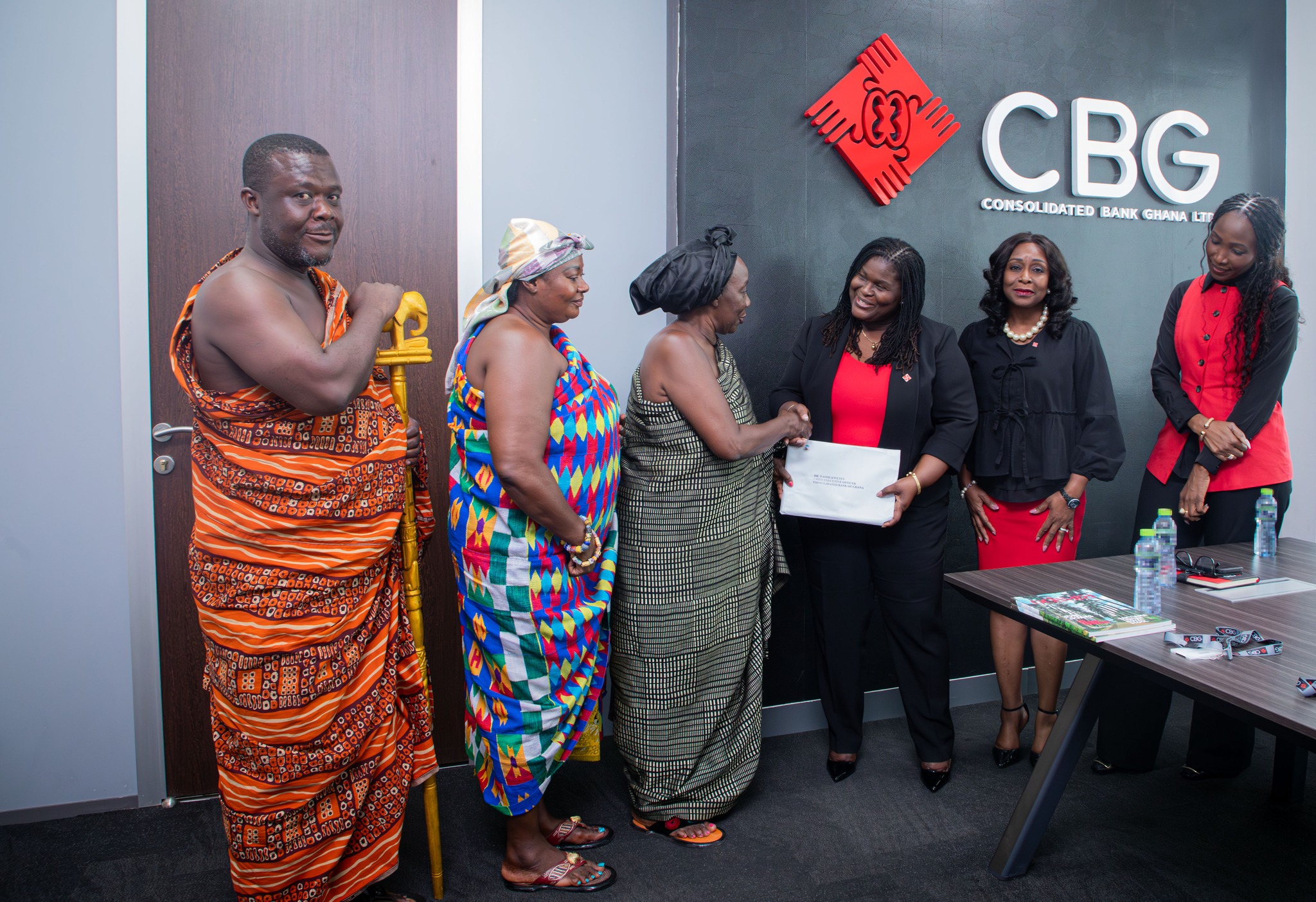 It was a humbling moment when Dr. Naomi Wolali Kwetey, MD of Consolidated Bank Ghana LTD (CBG) and her two deputies, Madam Sheila Azuntaba and Madam Florence Adei Ohene, received a delegation of Nananom from the Akuapem Traditional Area, representing Obrempongkese Oseadeeyo Kwasi Akuffo III, to pay a courtesy call on the management of the Bank.