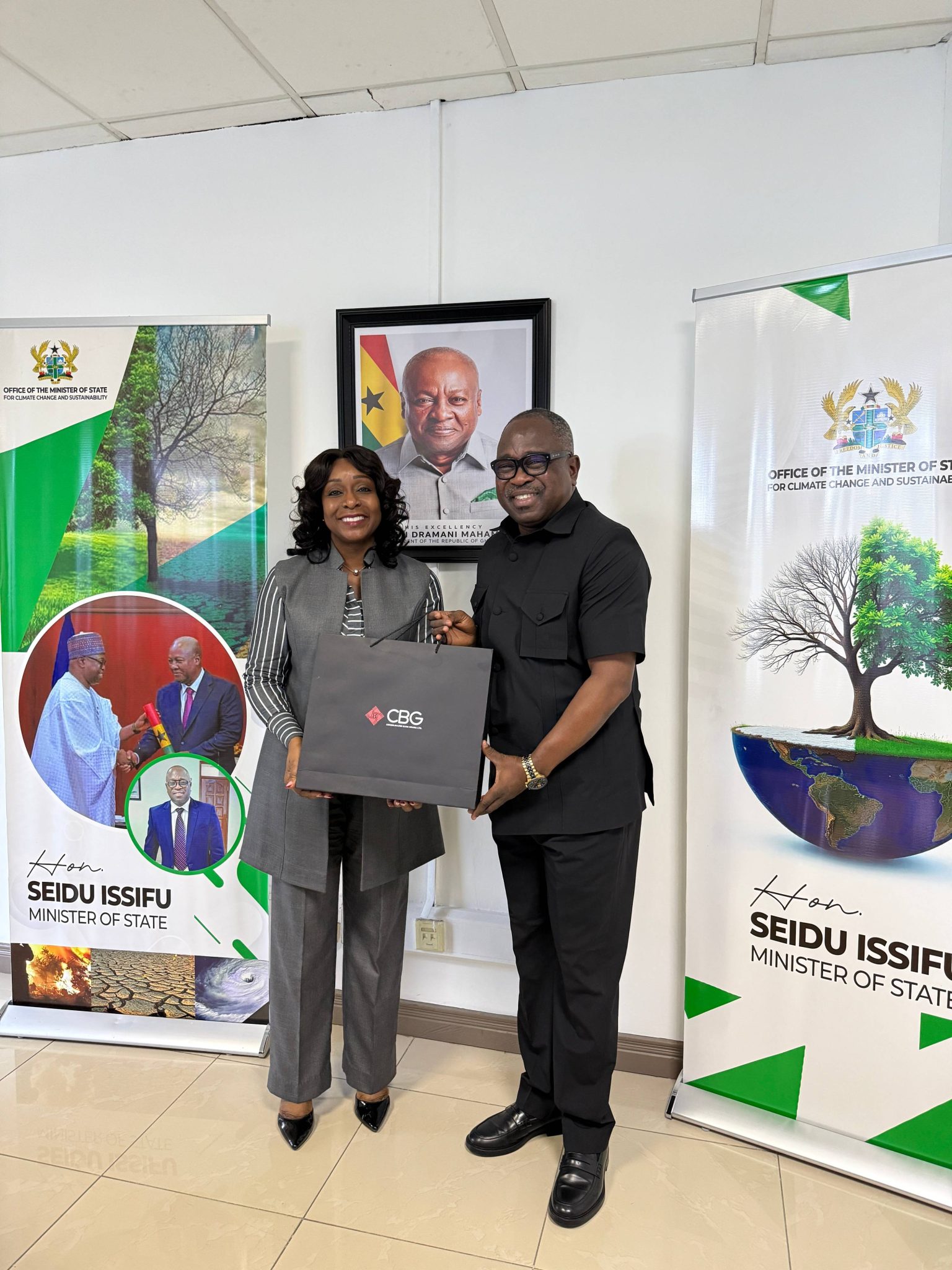 Representatives from Consolidated Bank Ghana Ltd. (CBG), led by the Deputy Managing Director of Retail Banking, Operations, and Support Services, Mrs. Florence Adei Ohene, have paid a working visit to the Honourable Issifu Seidu, Minister of State for Climate Change and Sustainability.